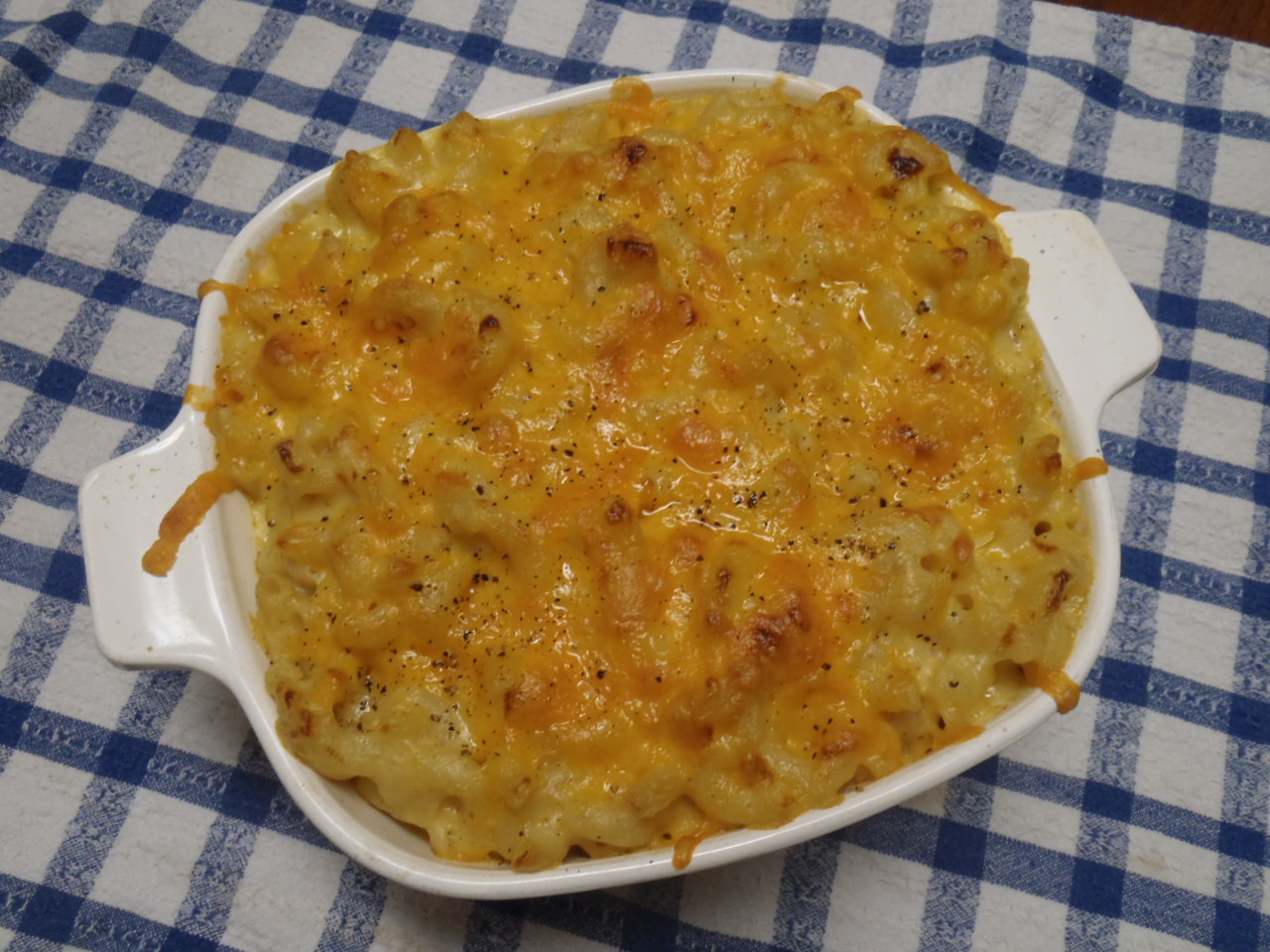 My mom’s mac and cheese has three ingredients: parboiled macaroni, canned tomato juice, and grated cheddar are mixed in a casserole and baked in the oven until the juice has reduced to a sauce and the cheese has formed a crust on the top. Taken with black pepper.