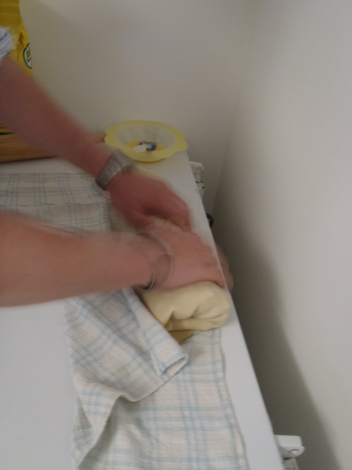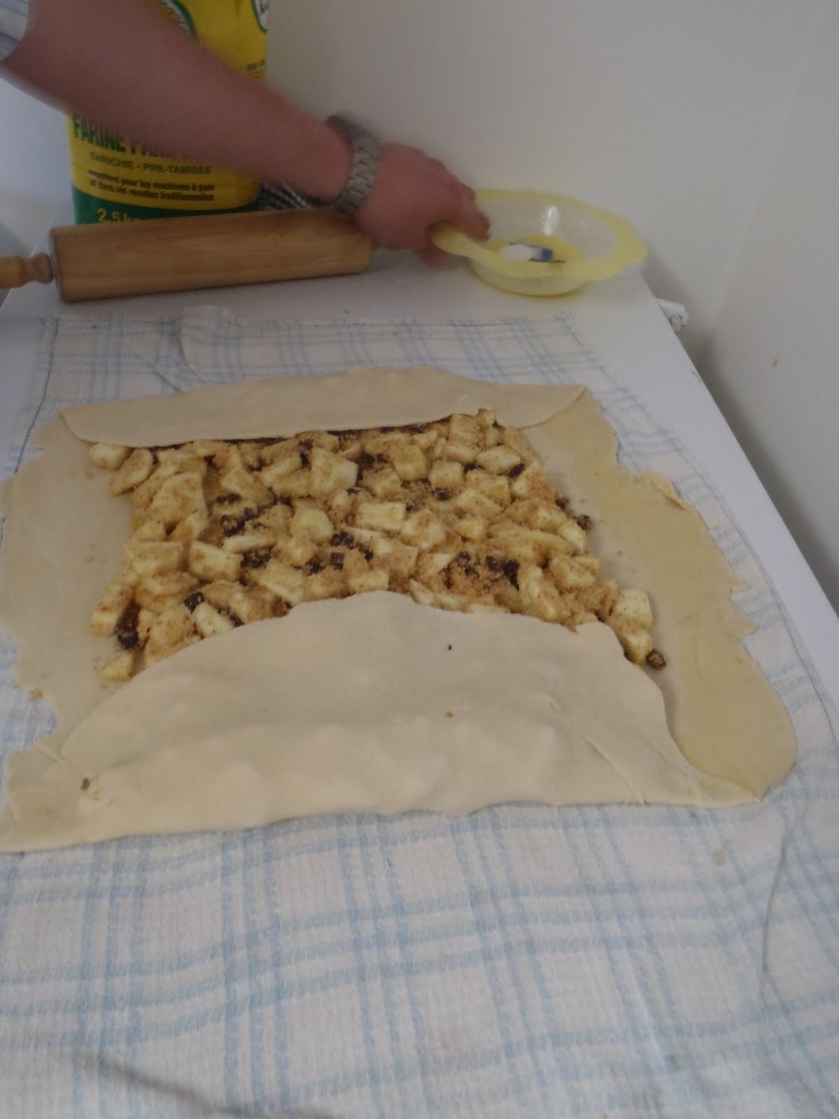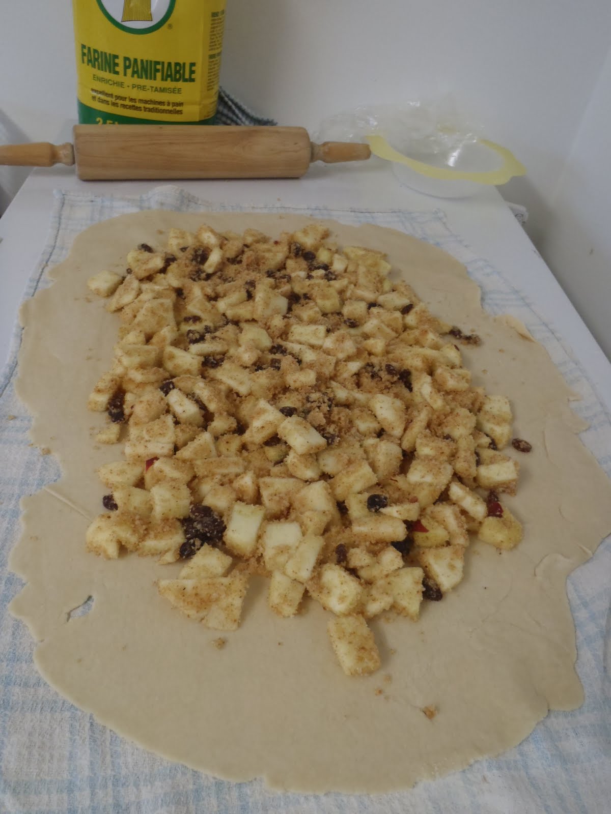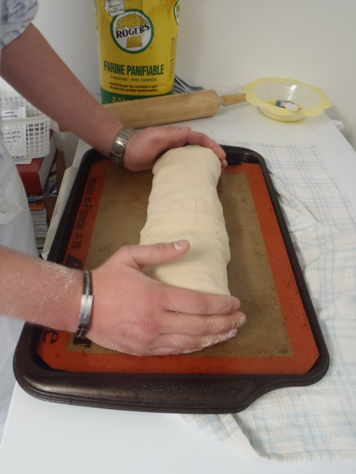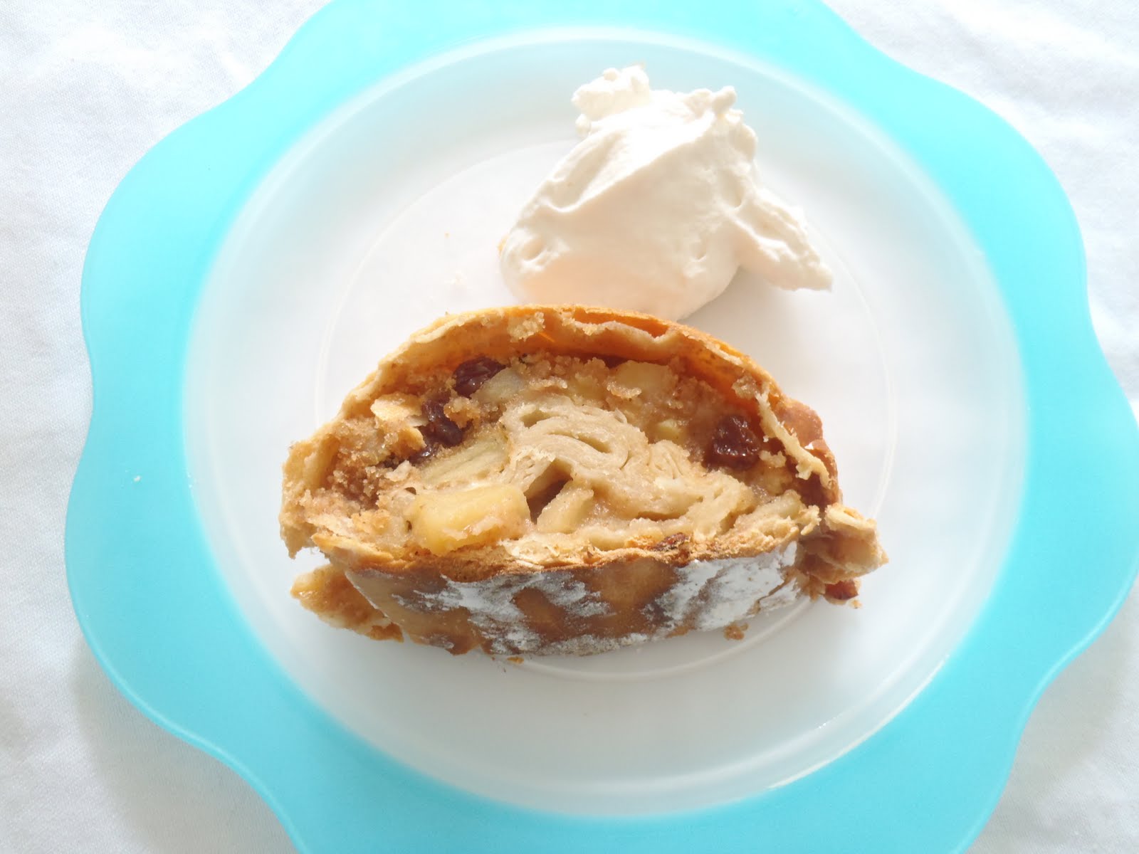 Strudel was another dish that I thought I understood quite well: puff pastry with a jam-like filling. Apparently that is a French-style strudel, a far cry from the Viennese strudel of Dominik’s homeland. His was a long cylinder of apples, raisins, rum, sugar, and bread crumbs, rolled into pastry by an ingenious dish-towel method (see below). The log was then sliced and served with whipped cream.