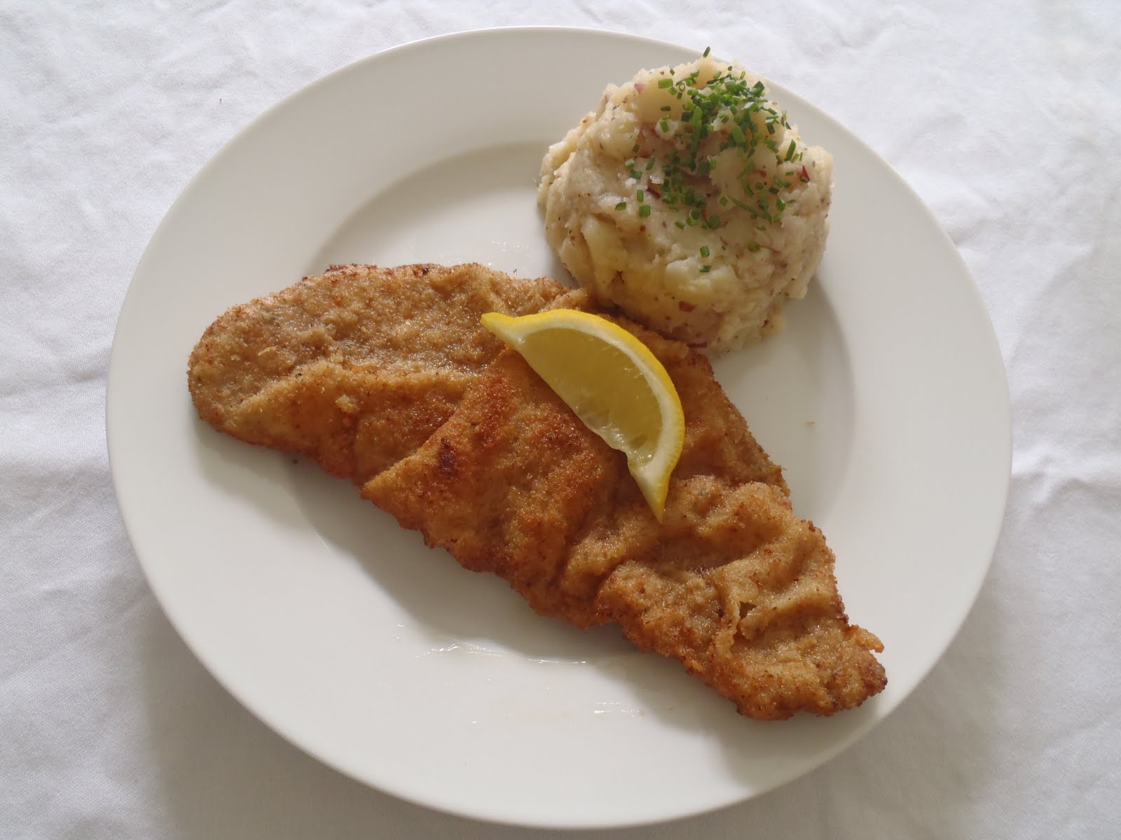 The schnitzel was dredged in flour, egg wash, bread crumbs, and then fried. The meat was very nearly submerged in the oil. Apparently Austrian restaurants cook their schnitzel in the deep-fryer, not a pan.