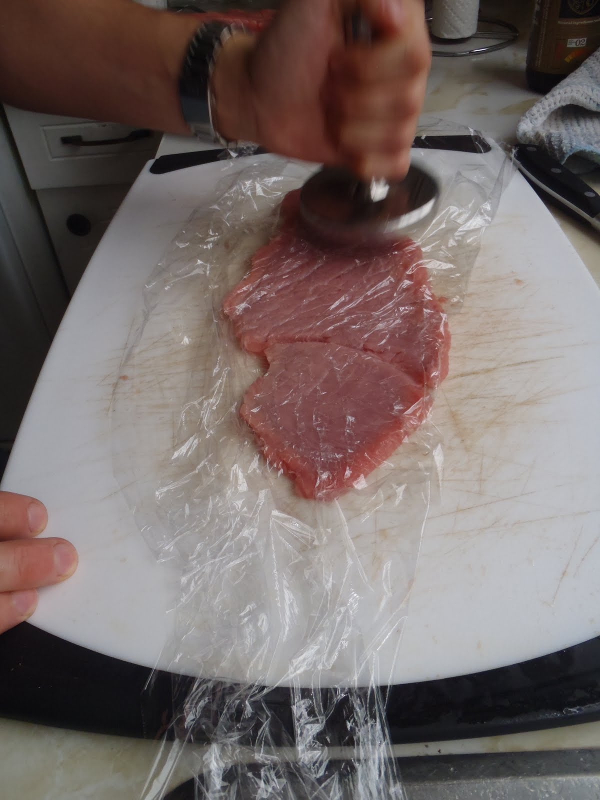 Mike cut the round into slices about 3/8″ thick, then pounded them a little flatter than 1/4″. “Pounding” is a pretty misleading description of what Mike did. There was a pronounced horizontal aspect to his strokes, which stretched the meat without tearing it.