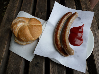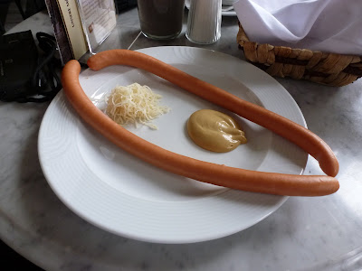 In North America the term “hot dog” refers to both the dish (ie. a wiener in a bun), and the style of wiener itself (ie. an emulsified link flavoured with garlic and smoke). In Austria a “hot dog” is a sausage shoved into a long, crusty roll. You can therefore have, for instance, a bratwurst hot dog, or a burenwurst hot dog. If you don’t specify “hot dog,” your sausage will probably be served with a round crusty bun on the side, as below. Note the ceramic plate.