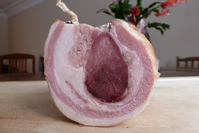 A while back I wrote a post on cold-cut Bath chaps: a boned-out pig’s head, cured, rolled around the tongue, tied, poached, and sliced. While I was extremely happy with the look of those Bath chaps, they were pretty bland. I figure that the cure leached into the poaching liquid.