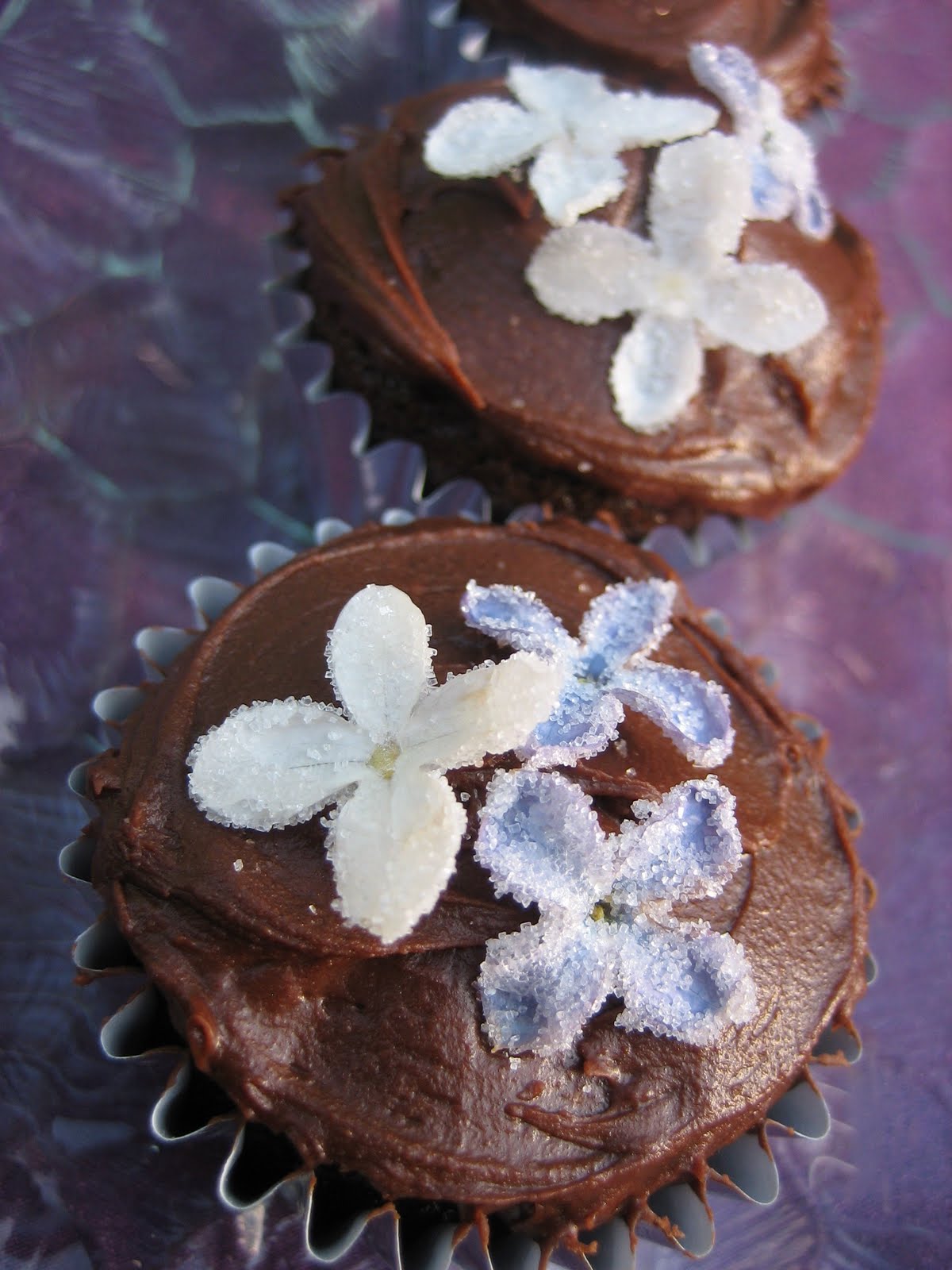 The candied petals look like delicate crystals – they are a beautiful garnish for cupcakes or ice cream. They have a crunchy texture and a sweet, floral taste. (They are flowers, after all…)