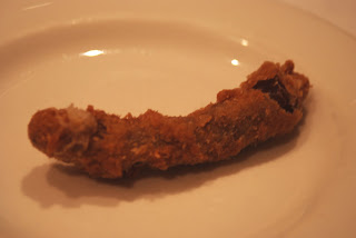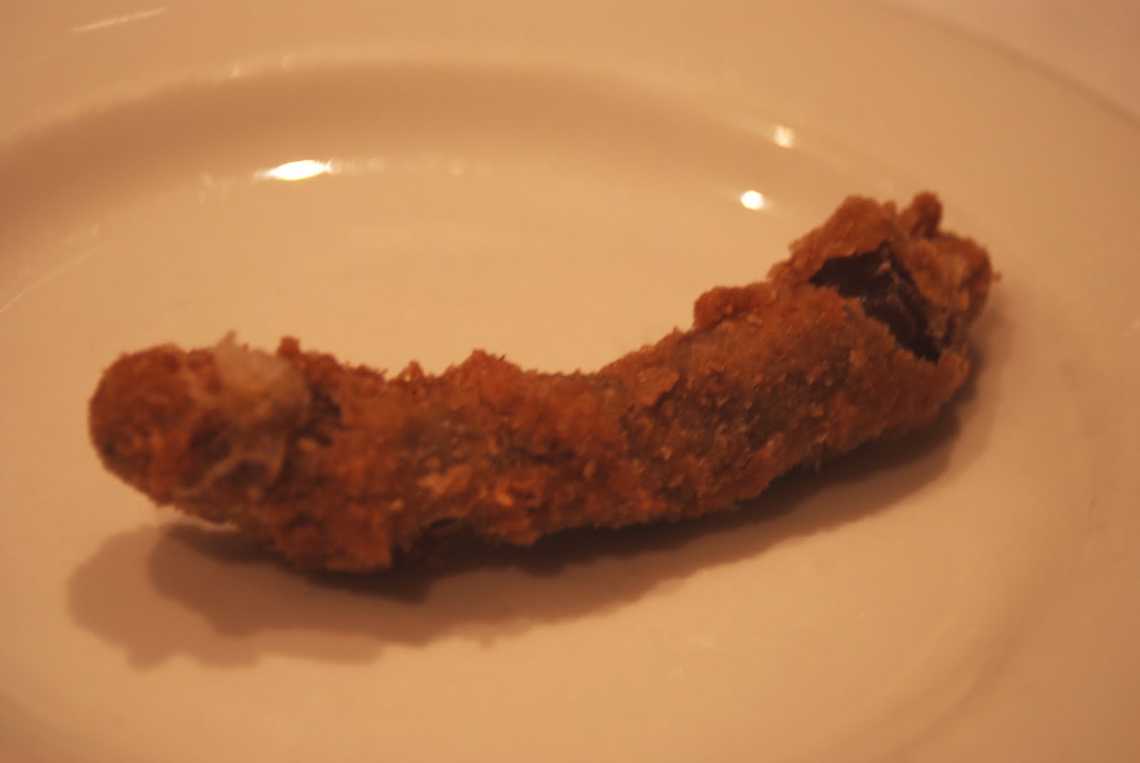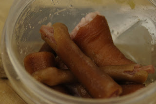 Finally we fried the tails until brown and crisp. They were served with hot mustard. Brined, smoked pork, clinging to a bone: a bit like a ham lollipop.