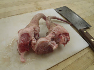 As with heads, tails usually have some whiskers that need to be shaved or singed. You can see that my tails both had a small piece of the rump still attached. That meat was later used as a garnish for the broth.