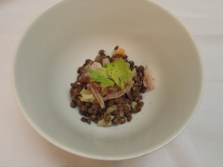 The broth was reheated and simmered with a few sprigs of rosemary. Once thoroughly infused, it was poured over green lentils, vegetables, and some of the shredded rump.