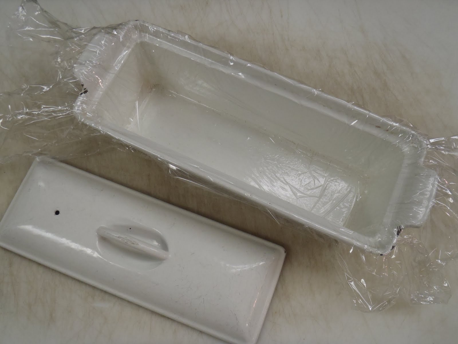 8: Shape and bake. A pâté like this would traditionally be packed into a terrine lined with plastic wrap, like the one below: