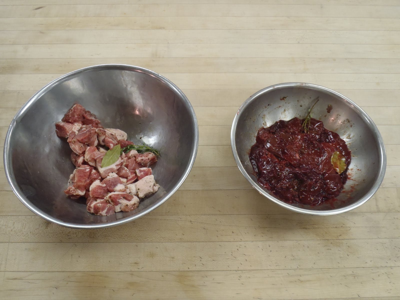 1: Season the pork and liver (separately), with salt, pepper, bay, and thyme. Leave the mixtures overnight in the fridge.