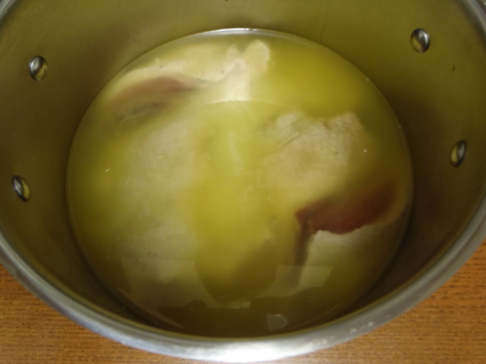 Even though the choice fat around the breasts and legs is going into our confit, there is still lots of fat to be rendered from the goose. Look for fatty trim around the neck and the opening of the cavity: these scraps can be rendered into pure fat. What do you do with pure goose fat? Any cooking that you now do with canola can be done with goose or duck or pork fat. That includes frying potatoes. Confit, described below, requires a lot of fat. The exact amount depends on the size of your cooking vessel and how tightly you can place the meat within. Expect to use about three quarts. There will not be enough fat from this one bird to make the confit; you’ll have to supplement with fat from another source. I typically save trim from a few birds before I render it down.