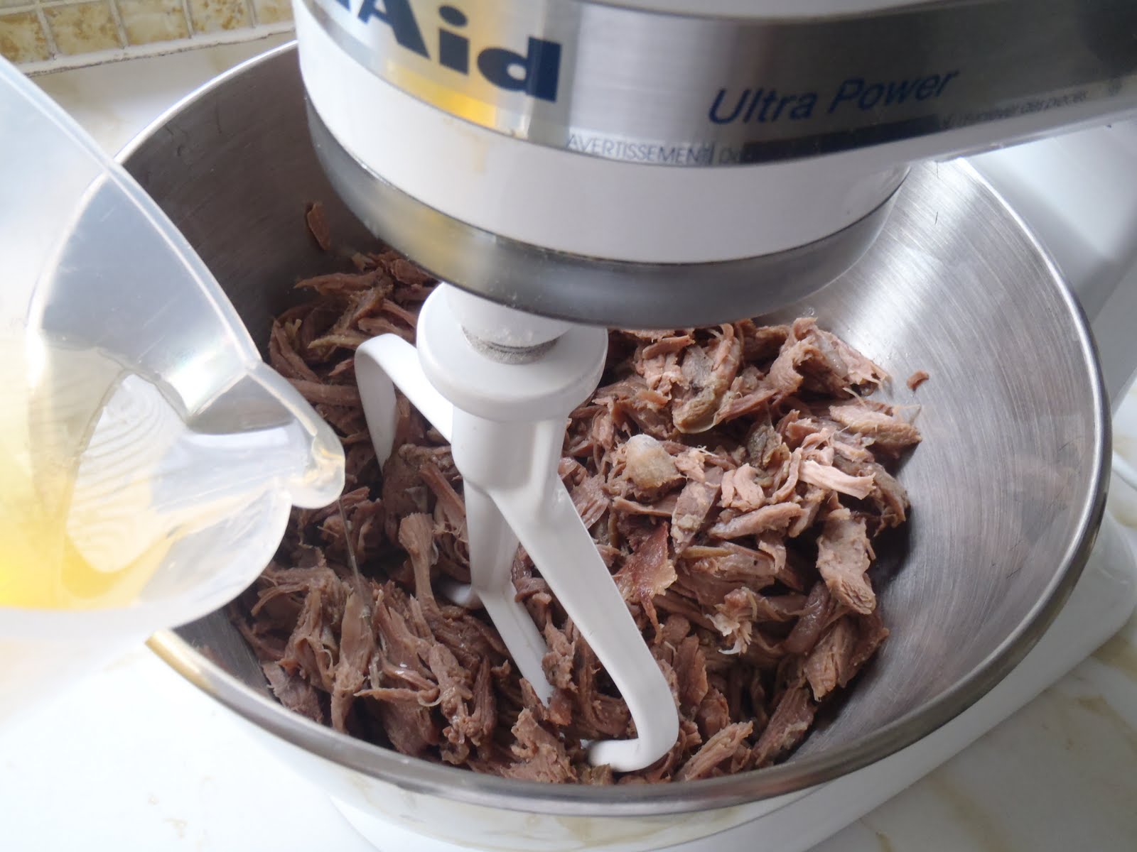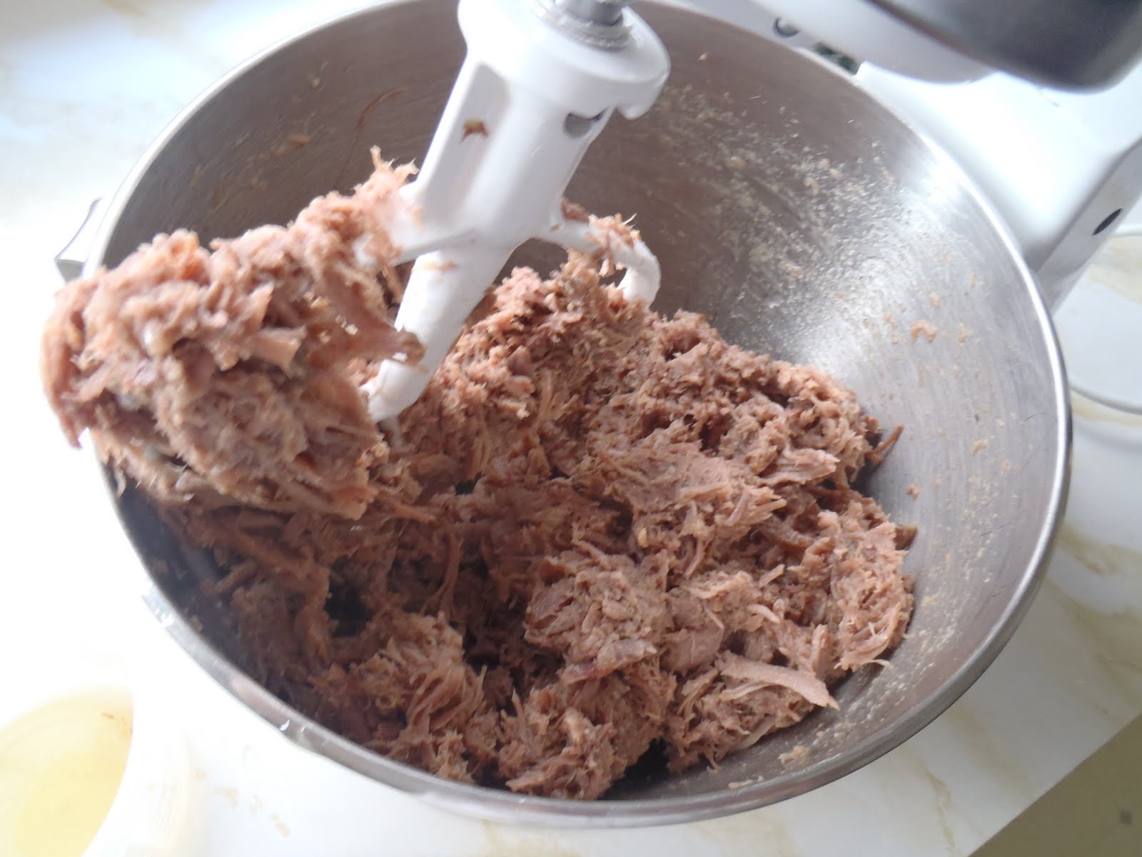Mix the pulled meat, slowly adding some of the cooking fat. The pieces of meat will start to come together and form a coarse paste.