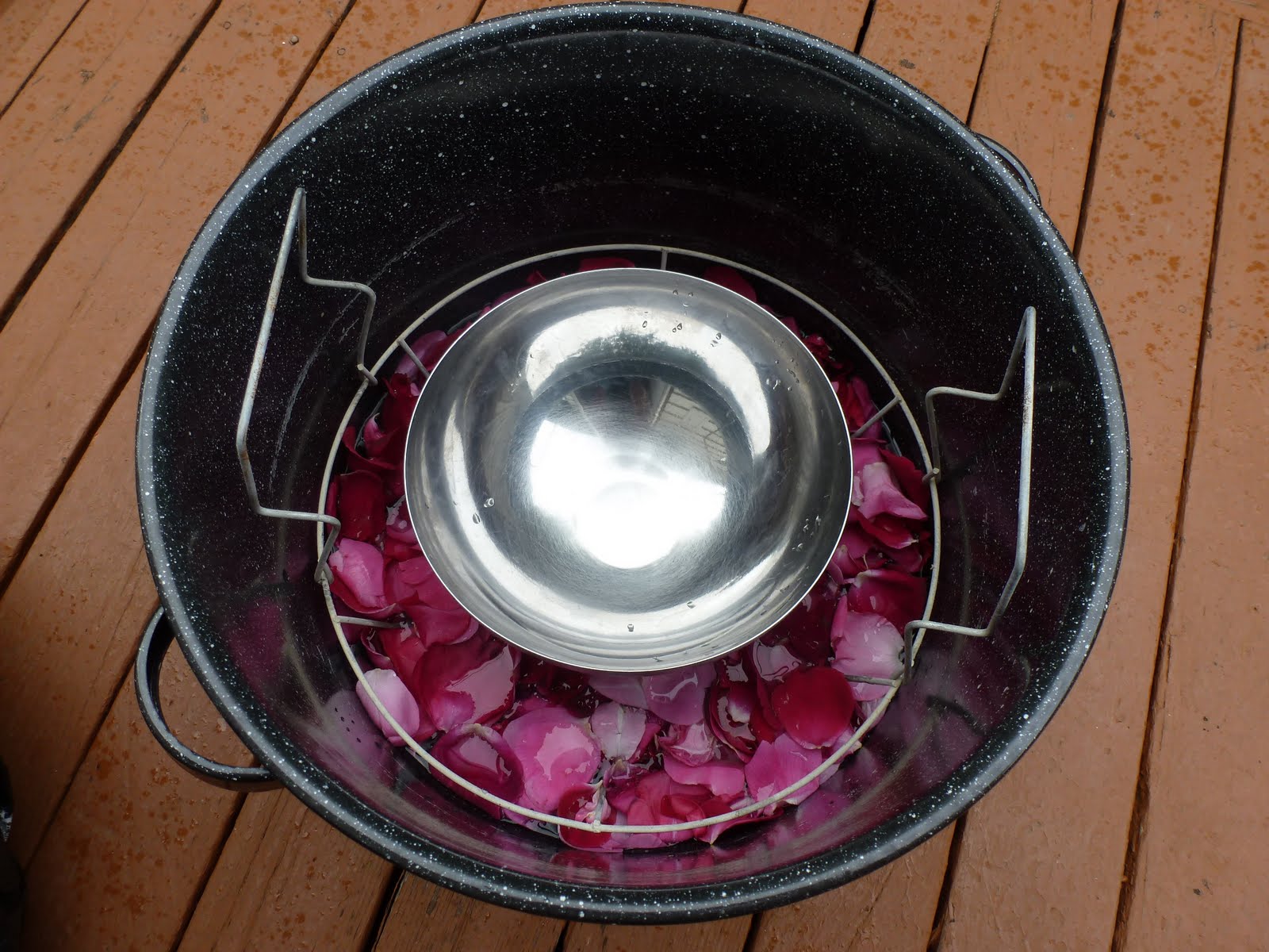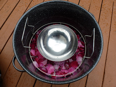 The set-up is simple. Start with a very large pot. I used my canning pot. Put a clean brick or heavy ceramic dish in the middle of the bottom. Scatter the rose petals around the brick. Add the water. There should be enough that the flowers are more or less submerged. Next put a stainless steel bowl that is slightly narrower than the canning pot onto the brick. (The brick simply keeps the bowl above the boiling water and prevents it from floating around.)