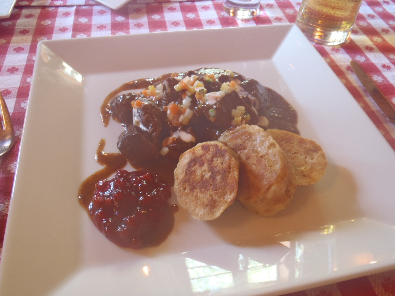 In Austria, Serviettenknödel are most often served with stews and braises. Below you can see them with Maibocgoulash (May deer goulash) and cranberries.