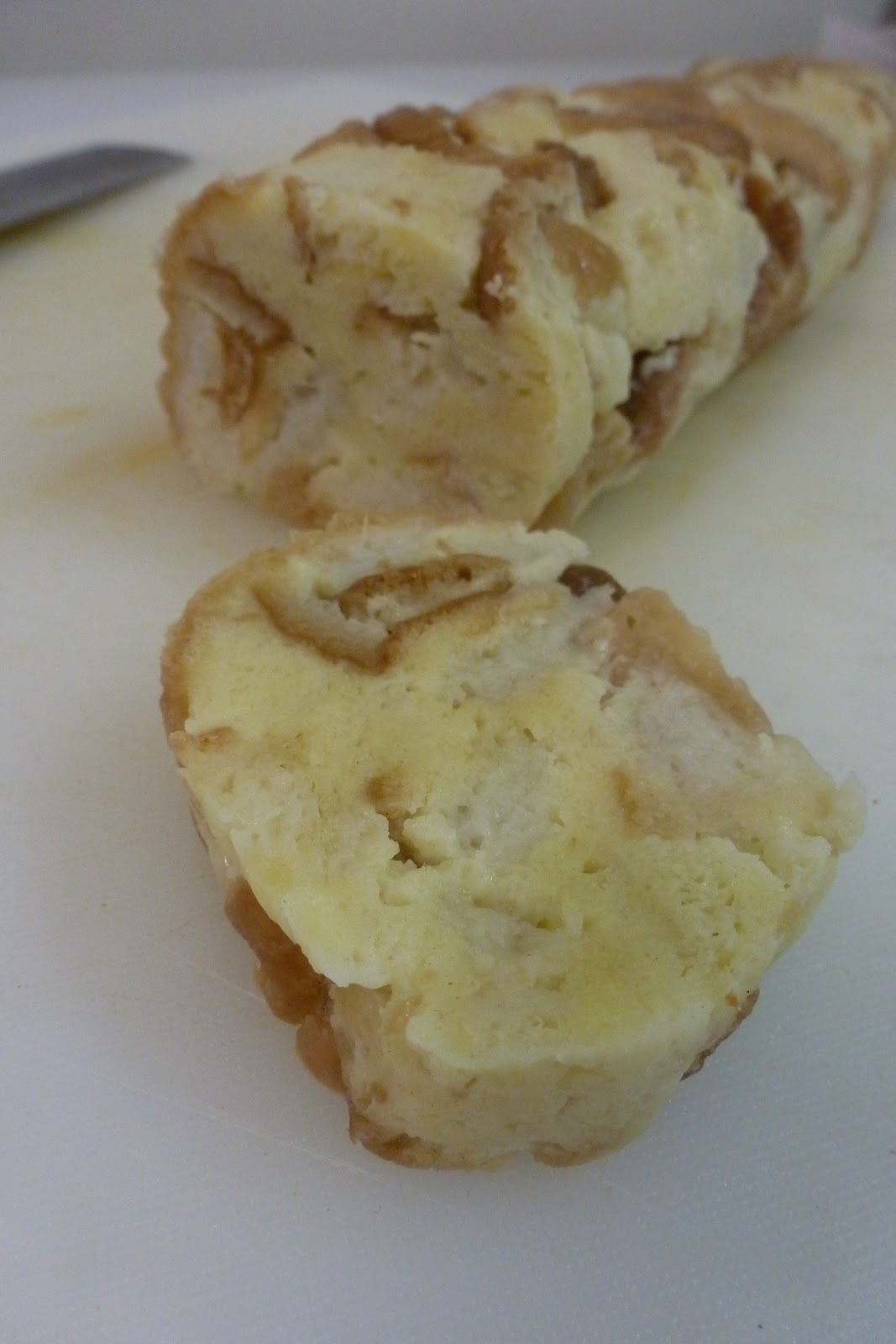 The rolls are steamed or poached until the egg has set, about thirty minutes, though cooking time depends on the diameter of the dumpling. Once cooked the rolls can be chilled overnight, then sliced into rounds.