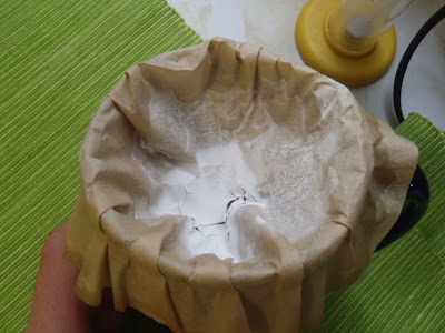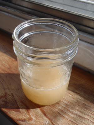 If you want clear syrup, you have to remove the “sugar sand,” the calcium compound that is clouding the liquid. Lisa and I simply stopped boiling partway through the reduction, let the sugar sand settle to the bottom of the pot, then decanted the syrup and continued boiling. My understanding is that the sugar sand is not harmful in any way; it’s removed simply to clarify the syrup. Here’s a picture of some of the sugar sand we filtered out: